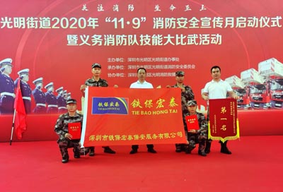深圳市光明區光明街道辦事處開展以“關注消防,生命至上”為主題的光明街道2020年“119”消防安全宣傳月啟動儀式暨義務消防隊技能大比武活動。光明街道辦、消防隊委員會、消防救援站等部門及鐵保宏泰深圳保安公司員工過百人參與本次活動。