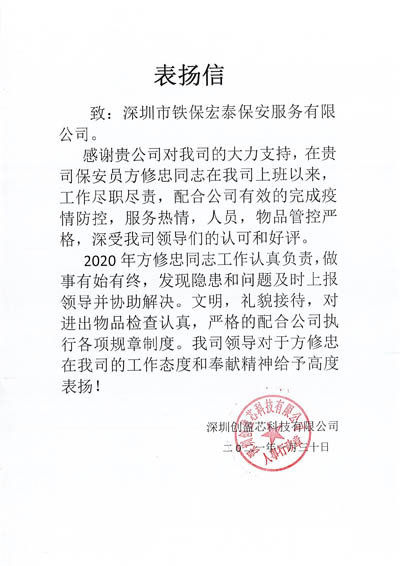 深圳創盈芯科技有限公司致信表揚我司鐵保宏泰深圳保安公司保安隊員方修忠同志工作盡職盡責,服務熱情,深受客戶公司領導們的認可和好評。