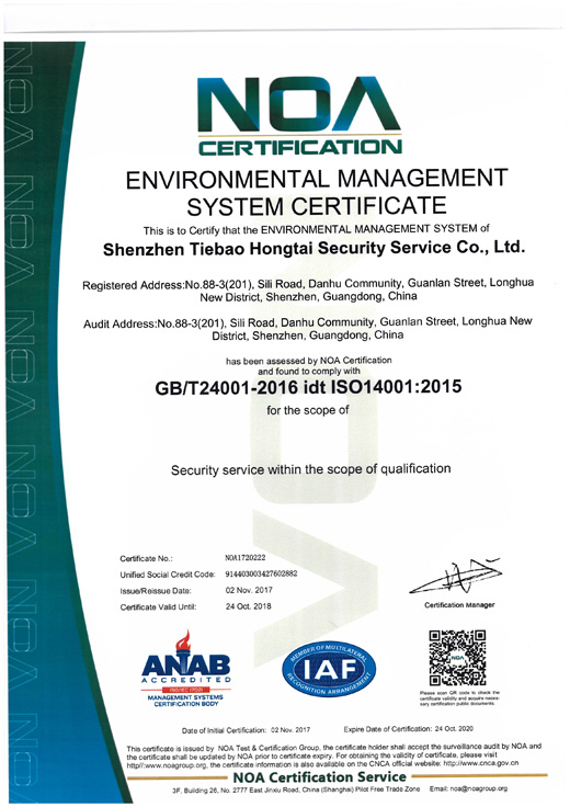 熱烈祝賀我司深圳市鐵保宏泰保安服務(wù)有限公司榮獲環(huán)境管理體系認(rèn)證證書(英文版),GB/T24001-2016 idt ISO14001:2015 標(biāo)準(zhǔn)。認(rèn)證范圍:資質(zhì)范圍內(nèi)保安服務(wù)。
