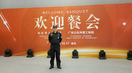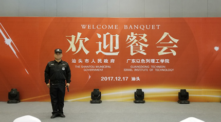 廣東以色列理工學院將舉辦“中以教育科技合作”系列活動,期間將舉行廣以理工學院揭牌和科技、文化等多項交流活動。汕頭市政府、廣東以色列理工學院聯合舉辦餐會,歡迎蒞汕出席活動的中以嘉賓。我司鐵保宏泰保安公司擔任餐會期間保安護衛。