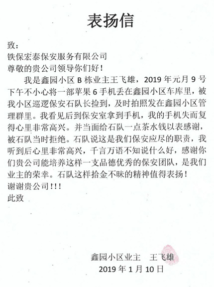 我是鑫園小區(qū)B棟業(yè)主,2019年元月9號下午不小心將一部蘋果6手機(jī)丟在鑫園小區(qū)車庫里,被我小區(qū)巡邏保安石隊長撿到,及時拍照發(fā)在鑫園小區(qū)管理群里。我看見后到保安室拿到手機(jī),我的手機(jī)失而復(fù)得心里非常高興。并當(dāng)面給石隊一點(diǎn)茶水錢以表感謝,被石隊當(dāng)時拒絕。石隊說這是我們保安應(yīng)盡的職責(zé),我聽到后心里非常高興,千言萬語不知說什么好,感謝你們貴公司能培養(yǎng)這樣一支品德優(yōu)秀的保安團(tuán)隊,是我們業(yè)主的榮幸。石隊這樣拾金不昧的精神值得表揚(yáng)!