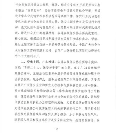 二、突出主題,豐富內容。各會員要在屬地公安機關的領導下,圍繞“喜迎二十大、保安護平安”主題,從發文之日起至7月24日組織開展保安正能量的主題演講、事跡宣講、競賽練兵、征文攝影等各類形式多樣的活動,展示保安行業發展成就和服務經濟社會發展、服務群眾、服務治安防范工作取得的成績;展示廣大保安企業和保安員積極參與服務各類重大活動安保、常態化疫情防控和搶險救災等工作作出的重要貢獻。